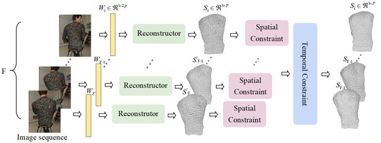 According to any dense NRSfM’s object that consists of dense feature points, we can assume that points in adjacent fields move in the same direction and most points between adjacent frames do not change significantly. Hence, we introduced temporal and spatial constraints to further improve the reconstruction outcomes.