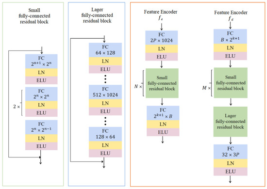 Network structure of the feature decoder . To improve the ability of the neural network to fit complex functions and better reconstruct the 3D structure of dense objects, we expanded the number of network layers based on the deformation auto-decoder [9], which is a series of nine fully connected layers with small hidden dimensions (2, 8, 8, 8, 16, 32, 32, 32, ), set the maximum number of layer nodes except for the output layer to 1024, used exponential linear units (ELU) as the activation units (except for the last layer), and added a layer normalization (LN) layer between each activation function and the neural network’s output. To alleviate the problem of network degradation induced by network deepening, we set the network to its residual form. When the number of neurons in the middle layer B is one, the entire network can be divided into four residual blocks. When , the entire network has a large residual block. The main architecture of in Figure 3.