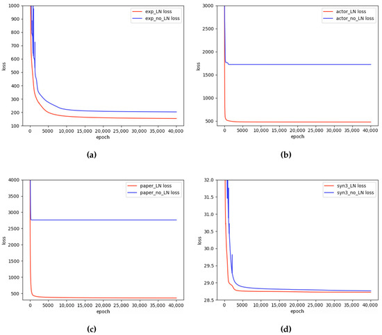 The necessity for layer normalization layers. To demonstrate the importance of LN layers in the shape-estimation network, we designed a series of controlled trials for shape-estimation networks with and without LN layers using the same loss function on the synthetic faces syn3, the real dataset actor mocap, expressions (sparser), and the Kinect dataset paper. The convergence curves of each dataset are shown in Figure 5.