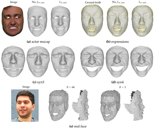 - Tewari, A.; Bernard, F.; Garrido, P.; Bharaj, G.; Elgharib, M.; Seidel, H.P.; Pérez, P.; Zollhofer, M.; Theobalt, C. Fml: Face model learning from videos. In Proceedings of the IEEE/CVF Conference on Computer Vision and Pattern Recognition, Long Beach, CA, USA, 15–20 June 2019; pp. 10812–10822. [Google Scholar]