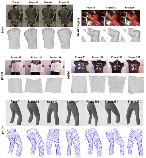 Visualizations of real sequence reconstruction results. The first row shows the reconstructed results of back and heart surgery sequences. The second row is the visualization of Kinect sequences’ reconstruction results. The third row shows the reconstruction effect of the heavily deformed sparse pants sequence, where DST-NRSfM achieves the lowest among all examined approaches. The reconstruction result of the real face sequence is shown in Figure 6e.