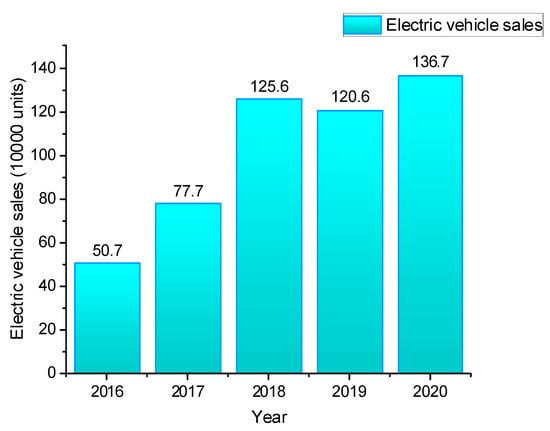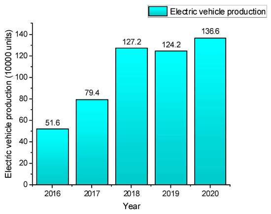 With the development of the automobile industry, the energy and environmental problems caused by fuel vehicles are becoming more and more serious. The development of electric vehicles has become an important measure to improve the current problems all over the world. Especially under the current “carbon neutral” trend, the development of electric vehicles is an important measure. In the outline of the national medium and long-term scientific and technological development plan (2006–2020) and the guiding opinions on accelerating the promotion and application of new energy vehicles, China has proposed several tasks for the development of electric vehicles. In order to make the corresponding policies, the country has increased its investment in electric vehicles during the 13th five-year plan period and implemented the key projects of “new energy vehicles”. With the encouragement of relevant policies, the output and sales of electric vehicles in China have shown an overall upward trend. During the first “13th five-year plan” period (2016–2020), China produced about 5.19 million electric vehicles, as shown in Figure 1, and sold about 5.113 million electric vehicles. As shown in Figure 2, China’s market share of electric vehicles in these five years exceeded 50% of the global total. Although the rapid growth of the electric vehicle market share effectively reduces the pressure on energy and the environment, it also brings more and more electric vehicle fire accidents.