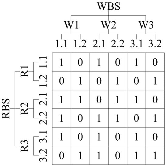 Through the analysis of combining the WBS breakdown and RBS breakdown of the project, a WBS-RBS cross-coupling matrix can be formed with the unit operation formed by WBS breakdown as the column and the sub-risks breakdown by RBS as the row. As shown in Figure 5, the point where the row and column intersect in the matrix is the possible risk in the operation process, where the number 1 indicates the existence of cross risk and the number 0 indicates the possibility of no cross risk [27].