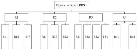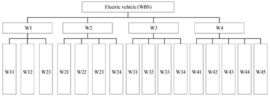 The WBS structure is built based on the system principle. Through the WBS structure, the overall structure of the electric vehicle can be decomposed layer by layer into more refined and easier-to-analyze system units. According to the electric vehicle design specifications and relevant research results, the overall structure of the electric vehicle is divided into four main systems: the whole vehicle control system, the power supply system, the electric drive system, and the auxiliary system, and then the four main systems are subdivided. The electric vehicle WBS decomposition structure tree was obtained, as shown in Figure 7. The system name corresponding to each system number is shown in Table 2.