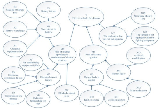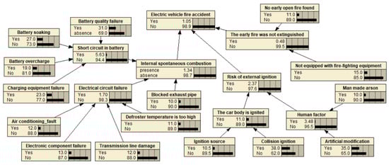 The risk factors of electric vehicle fire analyzed by the WBS-RBS coupling matrix were classified and summarized, and the electric vehicle fire disaster was divided into three aspects: the risk of internal thermal runaway of the vehicle, the risk of external ignition, and the failure of the early open fire to be extinguished. The risks of thermal runaway in the vehicle include short circuits in the power system, electrical circuit failure, and exhaust pipe blockage. The short circuit in the power supply system includes battery quality failure, battery overcharge, charging equipment failure, and battery pack flooding. Electrical circuit failures include air conditioning failures, electronic component failures, transmission line damage, and excessive temperature of the defroster. The risks of external ignition include external open fire, vehicle body ignition caused by collision ignition, and artificial modification and arson. If the early open fire is not extinguished, it includes that the early fire is not found and the vehicle is not equipped with fire-fighting equipment. Therefore, there are 15 basic risk factors leading to electric vehicle fire disasters. The logical relationship between the risk factors was clarified; the Bayesian network structure of electric vehicle fire disaster was constructed, as shown in Figure 9; and the Bayesian network structure enabled the relationship between electric vehicle fire accidents to be clearly and intuitively expressed.