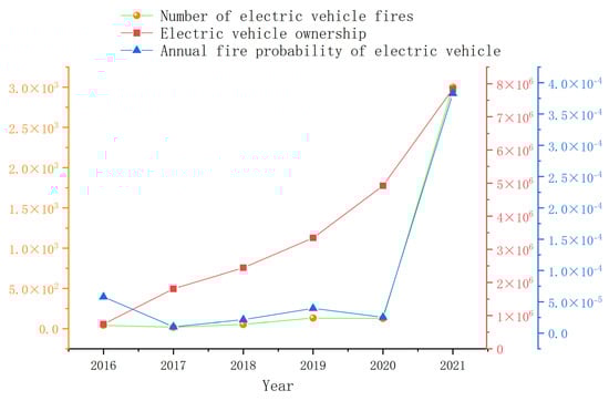 Change trend of electric vehicle retention, electric vehicle fire number, and fire probability from 2016 to 2021.