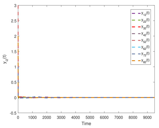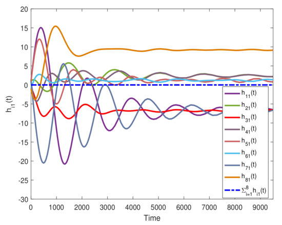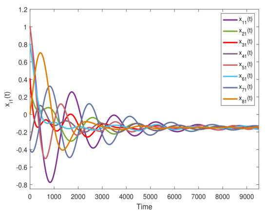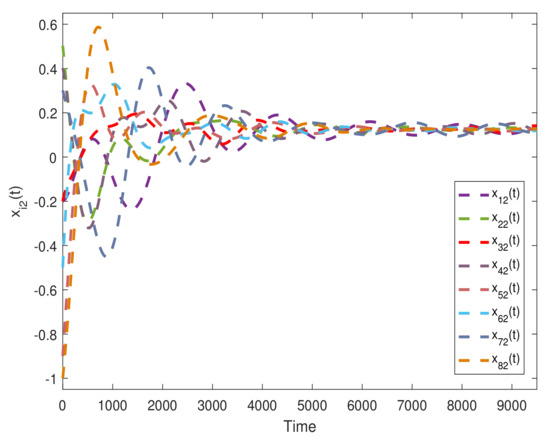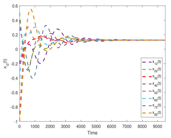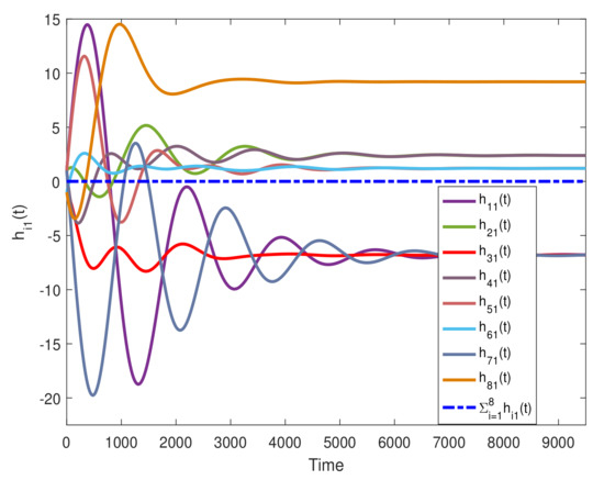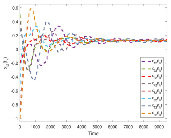 where , , and . By comparing the above inequalities, we can easily know that . Thus, we only need to prove , . From the condition of Theorem 1, , and if and only if . Therefore, consensus can be achieved. □