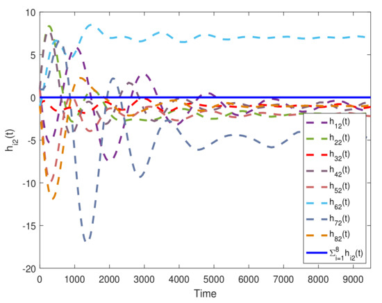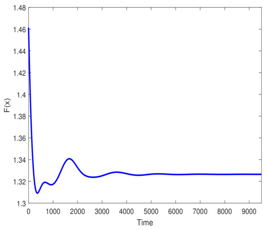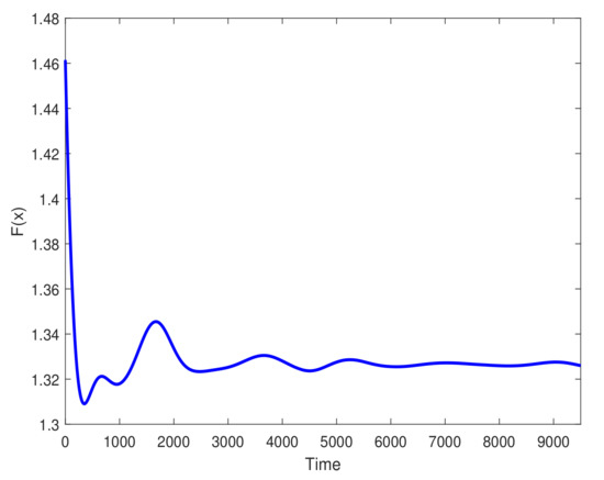 For the optimization problem (24), we use the proposed algorithm (3) with the above parameters. Through calculation, all conditions of Theorem 1 are satisfied. By using MATLAB software for simulation, the states of and are given in Figure 2 and Figure 3, respectively. It is noted that all agents’ states reach consensus and gradually converge to the optimal solution . Figure 4 and Figure 5 show the trajectories of and , respectively. Obviously, and gradually converge to 0. Figure 6 and Figure 7 show the evolution trajectories of and , respectively. From Figure 6 and Figure 7, it can be seen that the condition of is always satisfied. Moreover, gradually converge to some constants. Based on the third equation of (3), that means all agents’ states asymptotically reach the same value. The evolution trajectory of the objective function is shown in Figure 8.