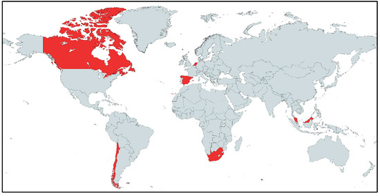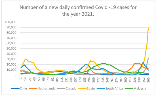 Six countries will be the focus of the study and the validation of the new forecasting approach. They are the Netherlands, Chile, Malaysia, Spain, Canada, and South Africa [29]. As can be noticed, these countries differ in a variety of ways that one may find to be correlated with the magnitude of the daily COVID-19 spread. As seen in Figure 1, they are distributed throughout many continents, have various characteristics, including diverse religions [30], socio-political aspects [31], economic and medical developments [32], climatic variations [33], population, and density and territorial sizes [34], etc.