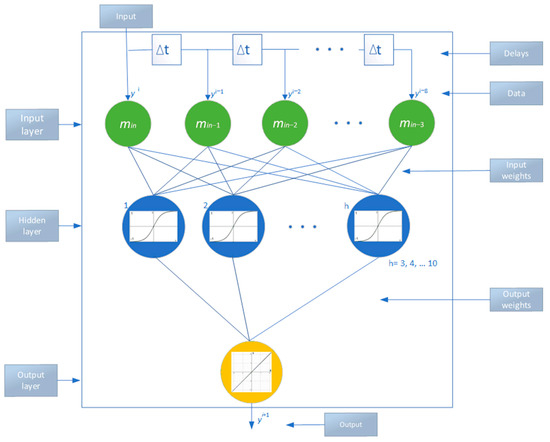 The development of ANNs as a tool with remarkable capabilities for identifying and modeling patterns of time series data that are difficult to identify by conventional statistical approaches has taken place during the past few decades. However, there is one aspect that most current ANN implementations for prediction share. In order to reach high prediction accuracy, a rather large time series is required. Typically, there have to be at least 50 data points to take into account [41]. However, the general opinion is that data from the recent past are more important than older ones and should have a significantly greater impact on the final prediction result. Based on this, we conclude that even in the case where we have a long time series at our disposal, we should apply methods that rely on short series. This, together with other studies that we have conducted in short-term forecasting [42,43,44], were the reasons that led us to select the Time Delay Neural Network architecture as the foundation for this research. A structure of a basic TDNNC is shown in Figure 3 and will be briefly explained next.