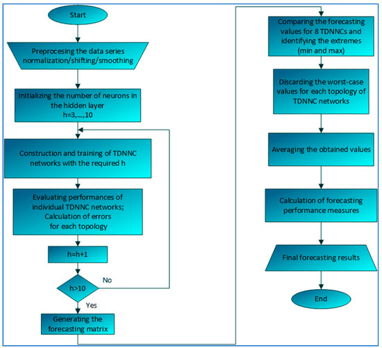 At the end of this process, all networks are trained with the entire time series dataset. The output of this procedure can be systematized as a forecasting matrix, in which rows correspond to the time instances for which the forecasts were produced, while the columns correspond to the number of hidden neurons in a specific TDNNC. There are eight columns in the forecasting matrix.