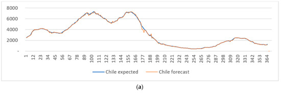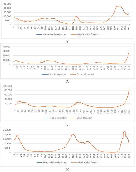 The forecasting performance of the suggested methodology is evaluated with datasets recorded for six countries for the year 2021. For each of six countries (Chile, the Netherlands, Spain, Canada, South Africa, and Malaysia), eight different TDNNCs are constructed. After applying training and forecast procedures, we have obtained final forecasts. They are systematized against their corresponding expected values on the graphs shown in Figure 5a–f. Bearing in mind that the characteristics of different sets of data vary from country to country, it can be noticed that the suggested forecasting system performed very well.