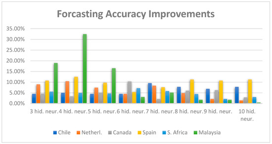 The relative percentual forecasting error for the suggested forecasting system is shown in the first column of Table 2, while the relative, i.e., percentual differences, between the accuracy of the suggested forecasting system and the individual TDNNCs’ forecasts are shown in the remaining eight columns. It can be noticed that the entire system outperforms the individual TDNNCs when observing the forecasting error for the year 2021 and fulfills the expectations. Using the suggested system, the increase in relative accuracy goes from 0.45% in the case of Malaysian TDNNC with 10 hidden neurons, to 32.42% in the case of TDNNC with four hidden neurons. This is also illustrated in Figure 6. Here, the X-axes denote the individual TDNNCs realization, while the Y-axes denote the percentual increase of the forecasting accuracy (relative error) between their individual forecasts and the forecasts of the optimal TDNNC based forecasting system that incorporates several individual TDNNCs. For example, the forecasting accuracy of the system (calculated as the averaged relative error of the forecasts) is larger than the accuracy achieved using only a single TDNNC for the same prediction. These increases are graphically represented with bars in different colors in Figure 6, where each color corresponds to a particular country.