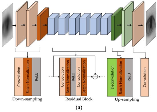 The generator model of OSRCycleGAN was modified to reduce the channel dimension based on a six-layer model consisting of residual connection with batch normalization (BN). The discriminator model was also modified in the same manner. Table 2 and Table 3 present the details of generator and discriminator of OSRCycleGAN used in this study. The ocular image used in this study includes the information of the eyelid, eyelash, pupil, iris, and sclera. The general shape of the eye is longer width-wise than length-wise. Therefore, a rectangular shape, as shown in Table 2 and Table 3, was used, instead of a square shape, as an input in a conventional CycleGAN to prevent the information from being lost. Because the basic architecture of proposed OSRCycleGAN is referred to the original CycleGAN, we followed the positions of BN batch normalization based on the structure of original CycleGAN.