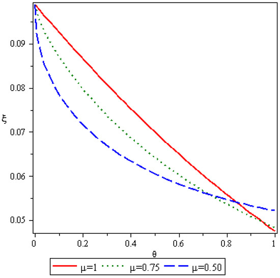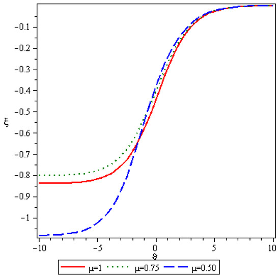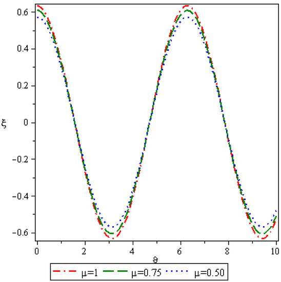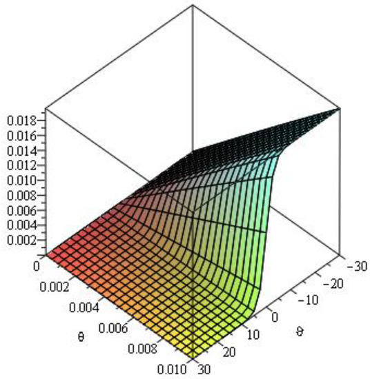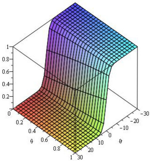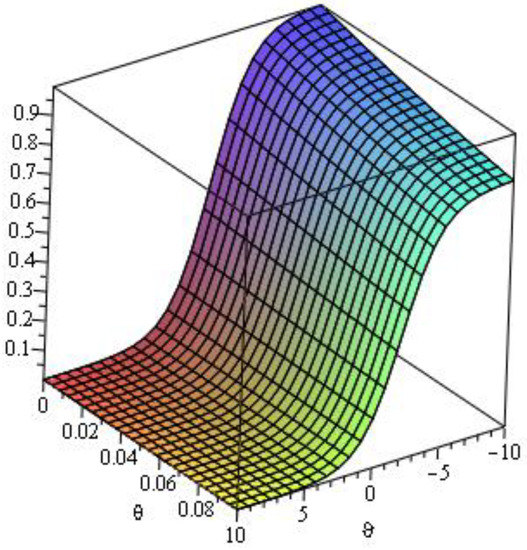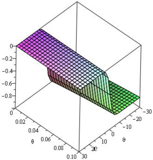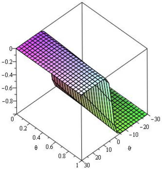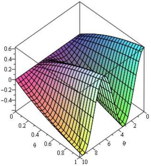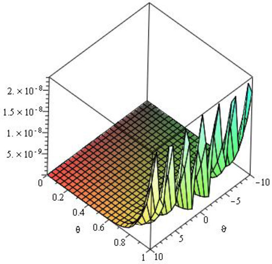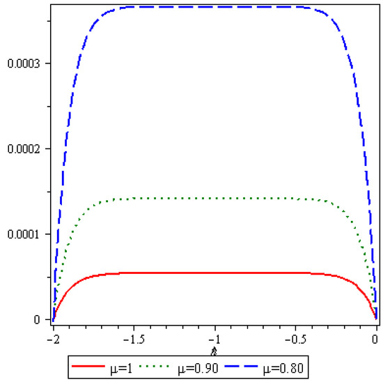 Here, we analyze numerical outcomes for diffusion Equation and AC Equation with the Caputo–Katugampola derivative for several values of and other effective parameters by using Maple 13. Figure 1 reveals the behavior of the q-HAGTM solution when and for diffusion Equation (27). Figure 2 narrates response of exact solution when and for diffusion Equation (27). Figure 3 demonstrates error between approximate solutions and exact solutions. Figure 4 represents the response of the q-HAGTM solution for diverse values of arbitrary order at Figure 5 yields q-HAGTM solution for numerous values of non-integer order at Figure 6 shows the curve for several values of order . Figure 7 reveals the curve for different values of order Figure 8 reveals the q-HAGTM solution for AC Equation (41) when , and . Figure 9 shows the exact solution for AC Equation (41) when , and . Figure 10 represents the error between approximate solutions and exact solutions for AC Equation (41) when , and . Figure 11 demonstrates behavior of q-HAGTM solution for AC Equation (41) for numerous values of fractional order μ at Figure 12 yields the behavior of q-HAGTM solution for AC Equation (41) for various values of non-integer order μ at Figure 13 shows the characteristic of q-HAGTM solution for AC Equation (54) when , and . Figure 14 imparts the exact solution for AC Equation (54) when , and . Figure 15 shows the error between approximate solutions and exact solutions for AC Equation (54) when , and . Figure 16 demonstrates characteristic of q-HAGTM solution for AC Equation (54) for various values of non-integer order at and Figure 17 represents response of q-HAGTM solution for AC Equation (54) for diverse values of fractional order at