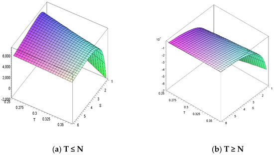 Therefore, from the Equation (21), for a fixed S become as concave function of T. It is shown in Figure 2b for the case II.
