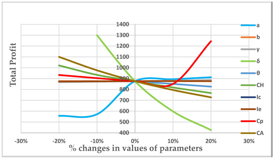 In order to perform a sensitivity analysis, parameters are changed by up to 10%, 10%, 20%, 20%. Table 4 illustrates the relationship between decision variables and the net income. Also, Figure 4 represents the variation in total profit due to the change in parameters.