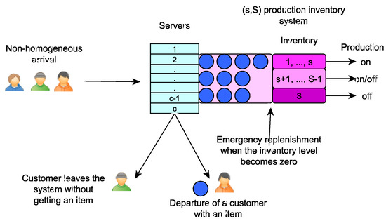 Consider a c-server () queuing inventory model with an inventory-level dependent Poisson arrival of customers. The service provided by each server has a duration that is exponentially distributed with parameter . On the completion of a service, the customer is served an item with probability . With probability , the customer is not served the item. The replenishment of inventory is through a production process that is controlled by the policy. To produce one unit of an item, the time required is phase-type distributed with representation of order m. This production time can be interpreted as the time until the underlying Markov chain , with a finite state space , reaches the single absorbing state , conditioned on the fact that the initial state of this process is selected as one of the states according to the initial probability vector . The transition rates within the set are defined by the generator T, and the transition rates into the absorbing state are given by .