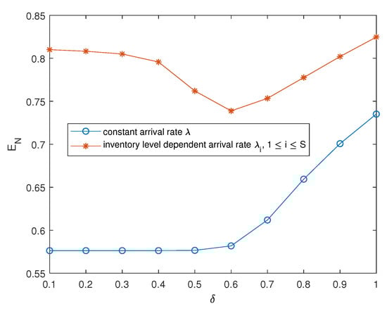 In this example, we give a comparison between the constant arrival case () and inventory-level-dependent arrival case () in Figure 9 and found the two cases to be showing entirely different behaviors.