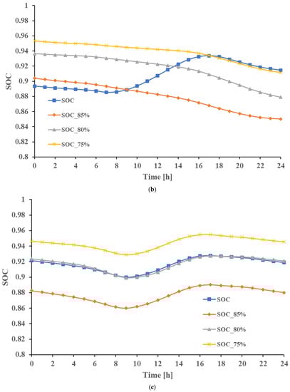 Battery modules state of charge variations during representative days of (a) spring, (b) summer, (c) autumn and (d) winter for first scenario with homogenous modules (SOC) and second scenario with heterogeneous modules.