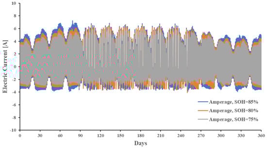 Moreover, for calculating the PV output amperage, Equation (1) is employed: