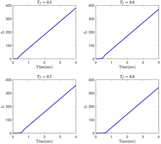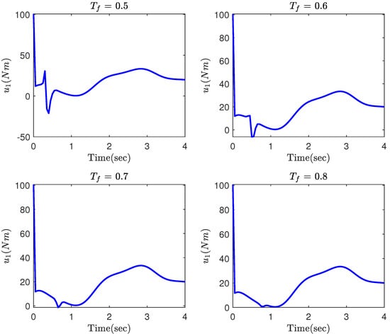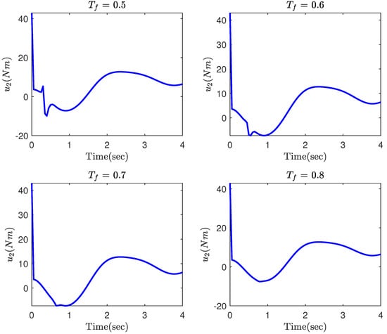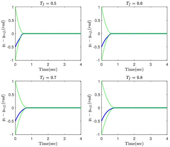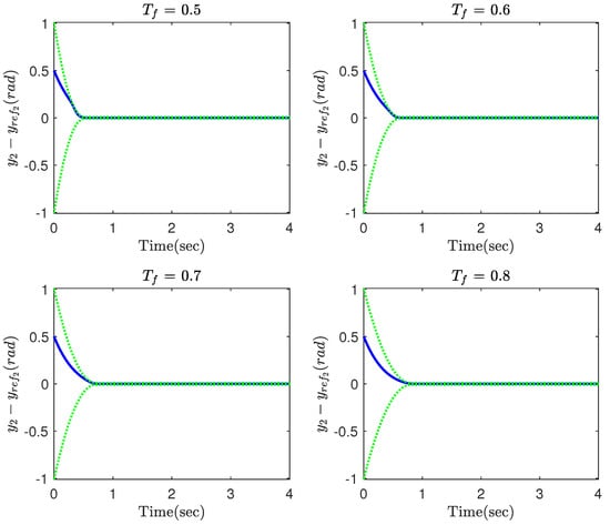 where and denote the mass and and represent the length of the links, m/s2 is the acceleration gravity, and and are the joint angles. The system parameters, the initial conditions and the reference trajectories are, respectively, taken as kg, m, , , and . The parameters of the controller (12) along with the FTPPF (5) are chosen as , , , , , , , , , , and . In this part, the simulation is repeated for different values of to investigate how this parameter affects the convergence property of the tracking errors. The simulation results are provided in Figure 2, Figure 3, Figure 4, Figure 5 and Figure 6. The time response of the tracking errors is illustrated in Figure 2 and Figure 3. Based on these two figures, it is clear that the proposed constrained control (12) is capable of satisfying the desired transient and steady state performances such as convergence rate and ultimate tracking error. Moreover, the proposed control is still able to meet the constraint on the tracking error even if the convergence time of the FTPPF is selected quite small. However, when the parameter is very small, then the controller is required to provide more control effort in order to maintain the error trajectory within its allowable region; otherwise, the error trajectory intercepts the boundary of the region and the constraint is violated. Therefore, from Figure 4 and Figure 5, the smaller convergence time is selected, the larger control effort is required. Moreover, parameter has been illustrated in Figure 6. Based on the definition of , it is a positive and increasing function since it is the integral of a positive function. It should be pointed out although the value of becomes larger as time goes, it is multiplied by , which very quickly converges to zero and has a small value.