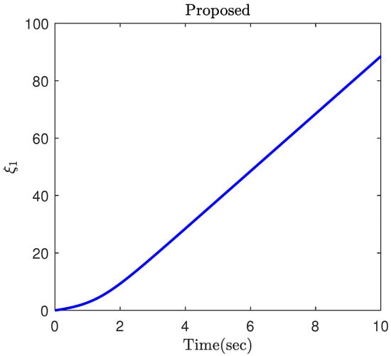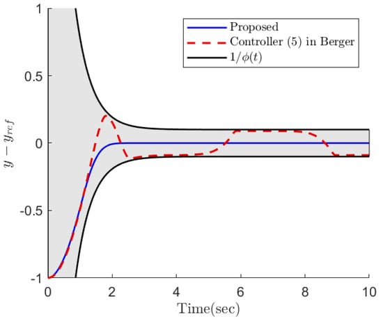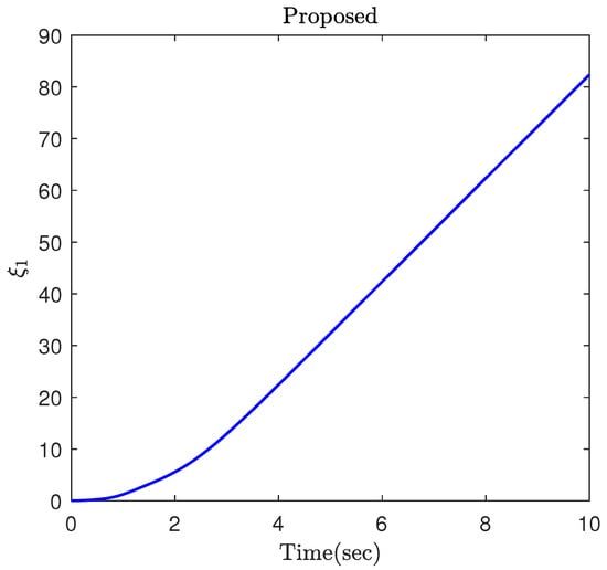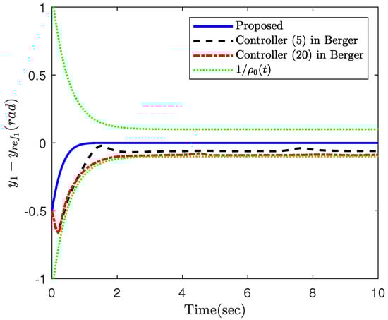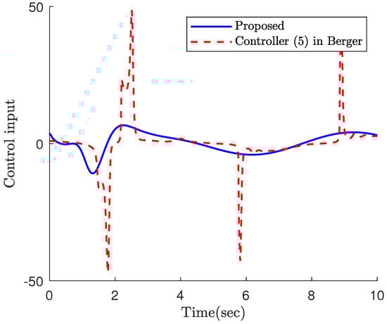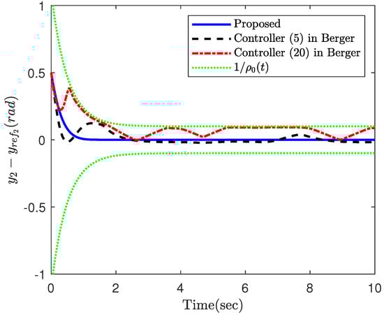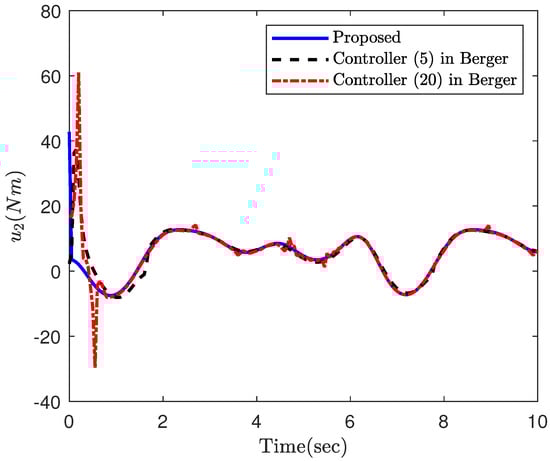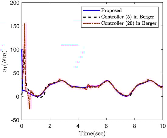 Part 2: In this part, the objective is to compare the proposed constrained control (12) with the constrained controls (5) and (20) in Berger [47]. In fact, ref. [47] is a constrained control for nonlinear systems and is a suitable candidate to investigate the efficacy of the proposed constrained control framework. The simulation results of the three controllers applied to the robotic manipulator (25) are illustrated in Figure 7, Figure 8, Figure 9, Figure 10 and Figure 11. In fact, the main focus of the constrained controls (5) and (20) in Berger [47] is to satisfy constraints on the tracking error, and they are not able to make the tracking errors converge to zero. Based on this example, the proposed control accomplishes superior performance over the two controls in Berger [47]. More specifically, the error trajectory under the proposed control shows oscillation neither in the transient nor the steady state. Moreover, the proposed approach results in a faster and more accurate convergence. Despite the better performance of the proposed approach, it requires less control energy, which is of crucial importance practically. This fact can be clearly observed in Figure 9 and Figure 10. Similar to the previous part, the parameter is depicted in Figure 11, which confirms the theoretical results provided in this paper.
