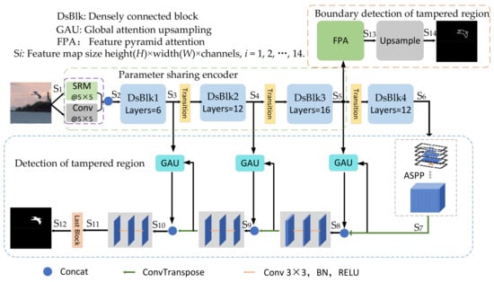 The tampered region detection network consists of a 12-layer pre-DenseBlock, an ASPP module and a three-step expansive path (lower horizontal path in Figure 2). The pre-DenseBlock continues the down-sampling following the previous three DenseBlocks in the encoder. The ASPP is introduced for adapting the model to tampered regions of different sizes and shapes because the atrous convolution in the ASPP has various dilation rates and facilitates the acquisition of multiscale receptive fields and multiscale tampering-related information. Each step in the expansive path consists of a feature map upsampling module (implemented by transposed convolution), a concatenation with the corresponding global attention map from the GAU module [30], and a stack of two convolutional layers. The last block is a 1 × 1 convolutional layer that restores the single-channel feature map output.