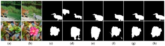 Ablation results of two images from CASIA2.0: (a) real images, (b) tampered images, (c) label image, (d) basic model, (e) basic model + SRM, (f) basic model + GAU, (g) basic model + SRM + GAU and (h) AttDAU-Net.