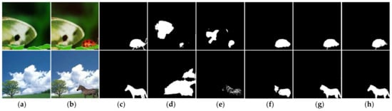 To verify the performance of the proposed splicing tampering detection model AttDAU-Net, extensive tests were conducted using different tampering detection methods, and the comparative results are presented in Table 1, Figure 4h and Figure 5h. In Table 1, ELA [38] is an error level analysis method that aims to detect differences between tampered and real images by detecting regions with different compression ratios in a JPEG image. Ye’s method [39] is a simple passive approach for detecting the inconsistencies of blocking artifacts caused by JPEG compression. Ye proposed an effective blocking artifact measure to reveal forgeries of digital images. FCNS [18], DeepLabV3 [28], PSPNet [40] and U-Net [25] are currently popular semantic segmentation models. DAU-Net is the same as the proposed AttDAU-Net, but without an attention mechanism. As shown in Table 1, for the CASIA1.0 and CASIA2.0 datasets, the proposed image tampering detection model, AttDAU-Net, had the best -score performance among all the methods used for comparison. ELA had the highest Recall at the cost of low Precision. DAU-Net had the best Precision at the cost of low Recall. Compared to DAU-Net, the proposed model increased the Recall on CASIA1.0 and CASIA2.0 by 8.36% and 2.79%, respectively. This indicates that the attention mechanism introduced in the proposed model plays an important role in improving the performance of the model. Figure 4a and Figure 5a show the four tampered regions in the four images, respectively. As can be seen in Figure 4h and Figure 5h, all four tampered regions were successfully detected.
