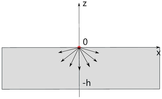 Assume that in the half-spaces and acoustic properties of the media are different. In the domain , the sound speed is equal to , while in , the sound speed varies with the depth z according to Equation (1).