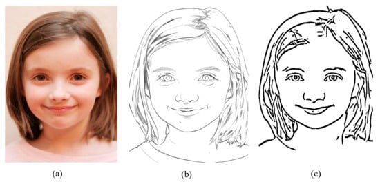 In computer graphics and computer vision research, many techniques that generate sketches from images have been presented. In the early days, the sketch generation schemes have been developed in the domain of image processing as edge-detection schemes. Widely used schemes including Canny edge [], XDoG [], and FDoG [] belong to this category. After deep learning has been introduced, example-based methods that require the pairs of target images and their corresponding sketches are widely studied. Among those schemes, pix2pix [], CycleGAN [], DualGAN [] or MUNIT [] produces sketches from their target images. Recently, several dedicated schemes based on CNN or RNN have been presented for extracting sketches from images [,,,,,]. These techniques, however, have a limitation that the quality of the results is deeply influenced by the quality of training dataset. Therefore, deep-learning-based sketch extraction models require training sets of high-quality image–sketch pairs for extracting visually convincing quality sketches from images.