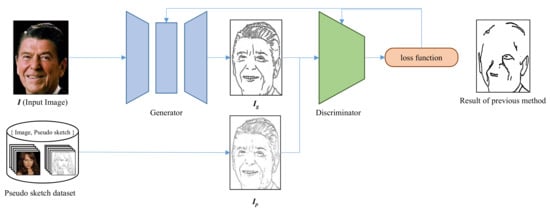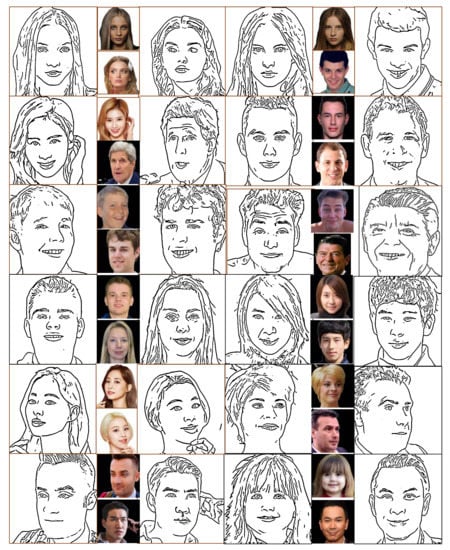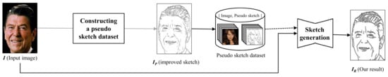 Line-based sketch images using a GAN structure [] is generated. The proposed model is pre-trained by Li et al.’s strategy [] that produces line-based sketch images from various ranges of input images. Since the domain is restricted to human portraits, a transfer learning model that re-trains the pre-trained model is executed with the produced pseudo-sketch dataset, which was constructed in the previous stage.