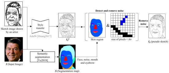 The first step of the proposed approach is to build a set of pseudo-sketch images from input hedcut portrait images using an existing style transfer model. The AdaIN-based style transfer model [], which is recognized as one of the most effective style transfer models, is used. The AdaIN model successfully extracts important lines for a sketch (), but it also produces a lot of unwanted artifacts in the primitive sketch images. To diminish these artifacts, a semantic segmentation model [] was used to estimate a segmentation map that distinguishes important regions in a face image. This map is applied to the primitive sketches to diminish the artifacts. The short lines in a face that do not correspond to salient features in the segmentation map are recognized as artifacts and removed. To remove the artifacts, an adaptive thresholding technique is employed to compute average within the block size of the central pixel, which is experimentally assigned as 55. The average is set as a threshold. This operation is performed on all pixels to remove the artifacts. This post-processing produces pseudo-sketches (), which compose a pseudo-sketch dataset, which is a paired set of the input hedcut portrait image and its pseudo-sketch image. This process is illustrated in Figure 3.
