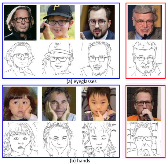 The proposed model is also applied for portrait images with obstacles such as eyeglasses or hands. Figure 6 presents the result images. As illustrated in Figure 6, most of the results are convincing. However, some portraits show somewhat unsatisfactory results. For an analysis, some portraits with unclear obstacles tend to produce unsatisfactory results. The man in the rightmost portrait wears frameless eyeglasses in Figure 6a, and the fingers of the man in the rightmost portrait are not clear in Figure 6b.