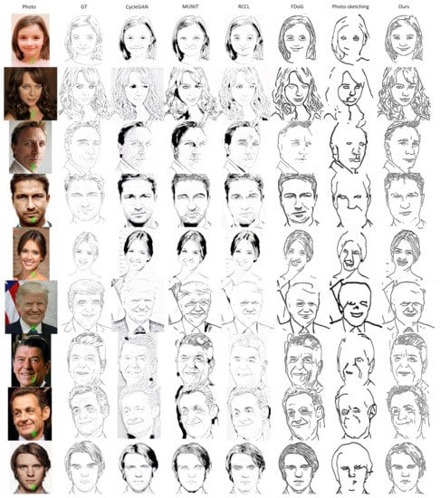 The produced results are compared with several existing schemes including CycleGAN [], MUNIT [], RCCL [], FDoG [], and Photo-sketching []. The produced results are further compared with GT images, which are created by professional artists. The visual comparison of the produced results is suggested in Figure 7.