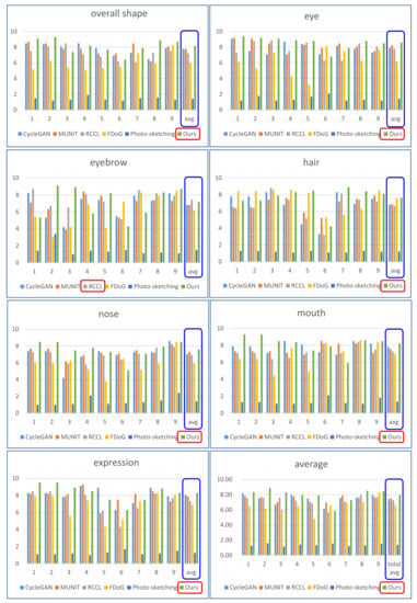 For the evaluation, two overall estimations and five local estimations were executed. For the overall estimation, participants were asked to evaluate the overall shape of the sketch and the preservation of the expression conveyed in the portrait in the sketch. The artist-created portraits are not presented for the participants. Participants were instructed to evaluate them on a 10-point scale. They were guided to give 1 point for the worst result and 10 for the best. The nine images in Figure 7 were employed for the user study. The answers from the participants are averaged and presented in the eight graphs in Figure 8, where the proposed model shows the best performance for six components. The proposed model shows the best overall average score.