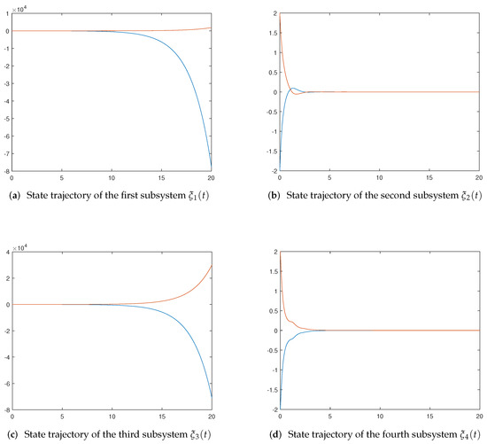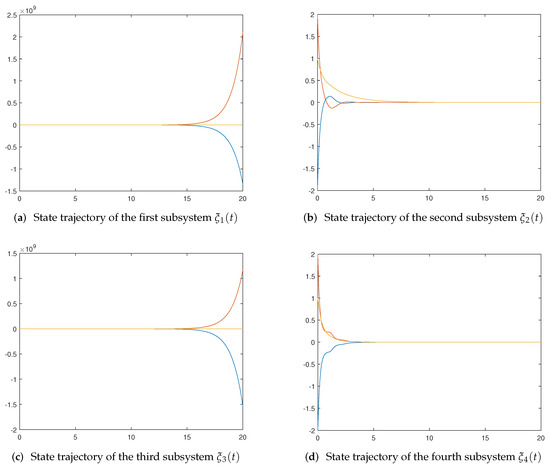 , choosing , then we can obtain . Let , . According to (7)–(13) in Theorem 1, we know that . The state trajectories of the whole system and each subsystem with partial state reset in (5) are depicted in Figure 3 and Figure 4, respectively. From the state trajectories of , we can see that the SNNs in (5) with more general partial state reset effects can also be exponentially stable.