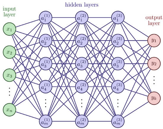 At least one hidden layer is required in ANNs. If the model has multiple hidden layers, each one is accountable for increasing its capacity. The ANN architecture is capable of executing activities that aid in producing model outputs. The neurons in the hidden layers can be activated using activation functions (e.g., Gaussian, triangular, sigmoidal, sine, and hyperbolic tangent). These activation functions are in charge of introducing the nonlinear aspect of the model’s activities. Backpropagation or Gradient Descent [16], Extreme Learning Machine [10], and others are examples of training methods for updating model parameters. An example of an artificial neural network is shown in Figure 1.