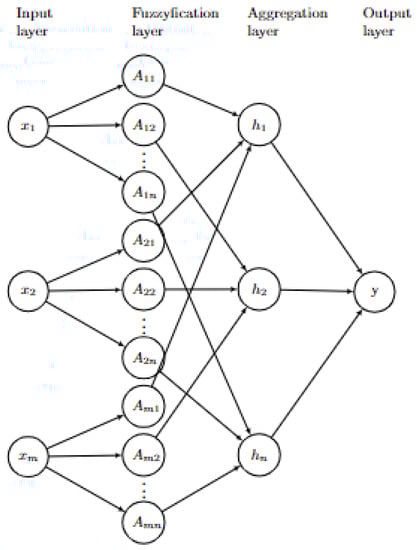 The architecture of a fuzzy neural network can be expressed in layers, where each one is responsible for a function in the model. Figure 2 represents a fuzzy neural networks in layers where one is responsible for the fuzzification process, the other takes the aggregation of fuzzy neurons, and the last layer is responsible for the model outputs. Recent proposals for fuzzy neural networks have addressed time-series forecasting [20,21], harmonic suppression [22], autonomous vehicles [23], and breast cancer [24].