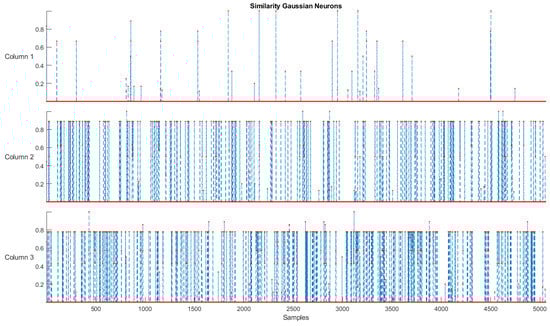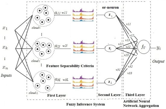 where () represents the degree of association related to the inputs submitted to the model, N is the number of inputs (features), and L represents the number of neurons. For each input variable , L neurons are defined , l = 1, … L, whose activation functions are composed of membership functions in the corresponding neurons [38].