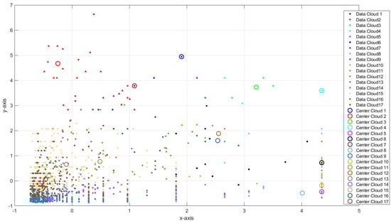 Stage 7—Forming Data Clouds: Once all samples are examined, SODA defines all the focal points of the existent centers in the direction-aware planes resulting from Stage 6. The subsequent steps are correlated to the global density estimation of the centers of the direction-aware plane through Equation (7), operating the supports of each direction-aware plane as the number of repetitions to be performed. Therefore, it obtains the global density, which is called [9]. Second, each direction-aware plane is examined using Condition 2 to find its neighboring direction-aware plane. In this circumstance, Condition 3 is used in order to confirm whether the underneath investigation is one of the local maxima of (), so that eventually all the identified maximum zones and the centers of the corresponding direction-aware planes, together with Condition 4, will act in the establishment of a focal point, and hence in the data clouds [9].