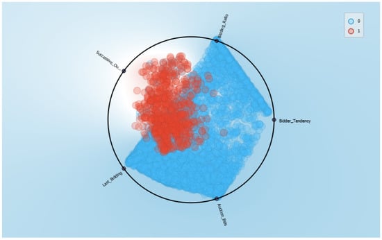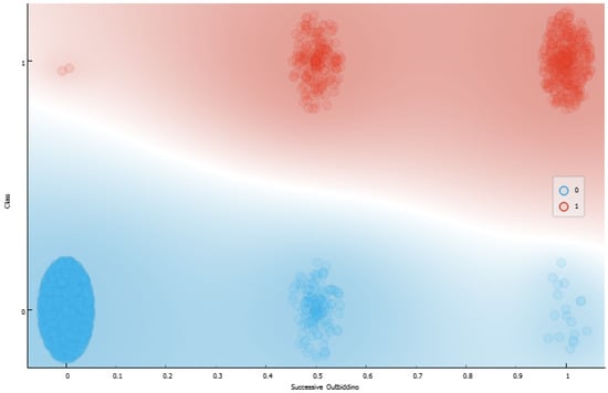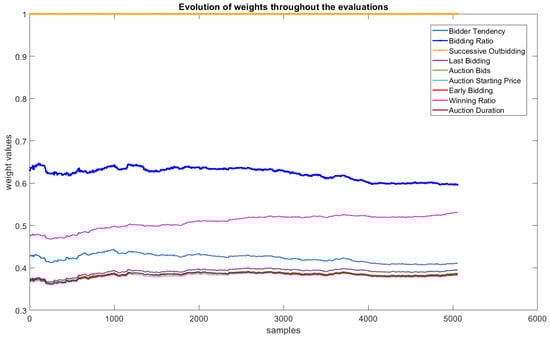 The evaluation of the evolving behavior of the problem features is also a relevant part of the interpretability of the results. This variation can be seen in Figure 13 and identifies how each weight generated according to the separability criterion (Equation (34)) was significant during the fraud classification process. The most relevant dimensions were successive outbidding, bidding ratio, and winning ratio (which makes sense when compared with the analysis in Figure 6). Figure 14 and Figure 15 present a graphical evaluation based on a scatter plot of the two dimensions that best contribute to the class separability criterion.