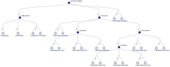The comparison of interpretability extracted by the eFNN-SODA model and the Fuzzy Hoeffding Decision Tree model (Figure 16) has some similarities and distinctions. The tree model is easier for visualizing the relationships, but the fuzzy rule model is closer to human reasoning. Regarding their similarities to the root of the tree shown in Figure 16 that has the Successive Outbidding as its central dimension, other nodes arise for the following evaluations. This corroborates that this is the first value to be analyzed in the tree, thus being the most relevant dimension. The generated fuzzy rules also identify this factor, as Successive Outbidding significantly impacts rule antecedents.