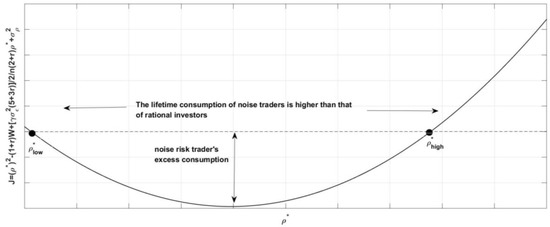 According to Figure 1, J is a parabola with upward opening, and it intersects with the abscissa to form a critical point where noise traders’ consumption is higher than that of rational investors. The intersection on the left is the lower limit of misconception, and the intersection on the right is the upper limit. False belief in makes noise traders have higher welfare than rational investors. On the contrary, if or , the welfare level of rational investors will exceed that of noise traders.