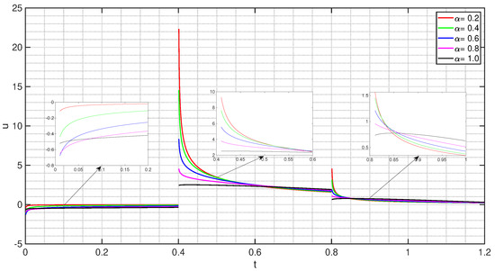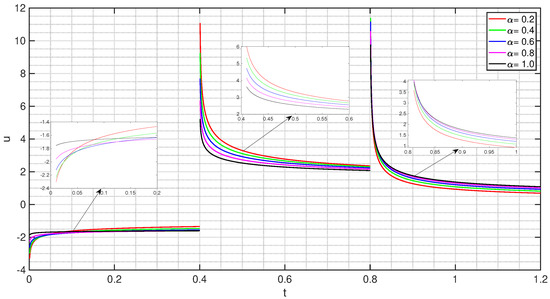 . Consider the functions and . By using (14), (22), (23), (24), the numerical values of Ξ, , , for , as shown in Table 1. From Lemma 7, we obtain the implicit solutions of the problem (49), as shown in Figure 1, via fixed values of , , and with vary for . By using (14), (22), (23), (24), the numerical values of Ξ, , , for , , as shown in Table 2. From Lemma 7, we obtain the implicit solutions of the problem (49) as shown in Figure 2 via fixed values of , , and with vary for . Later, by using (14), (22), (23), (24), the numerical values of Ξ, , , for , , as shown in Table 3. From Lemma 7, we obtain the implicit solutions of the problem (49) as shown in Figure 3 via fixed values of , , and with vary for . In addition, we will show the implicit solutions of the problem (49) as shown in Figure 4 for each values of , , , are given as in Table 4.