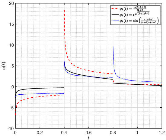 Since, all the conditions of Theorem 1 are fulfilled. Then, the impulsive -Hilfer --s (49) has a unique solution on . Moreover, by Theorem 3, we also find that