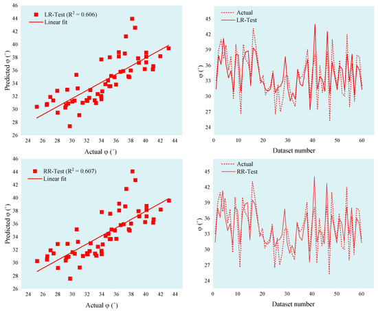 Figure 4 shows a comparison of scatter plots and performance plots between the actual and predicted values of the φ (°) at the test level for the LR, RR, DT, and SVM models. Based on the test prediction, the R2 of each model is computed. The R2 values of LR, RR, DT, and SVM models for the φ (°) are 0.606, 0.607, 0.822, and 0.916, respectively.