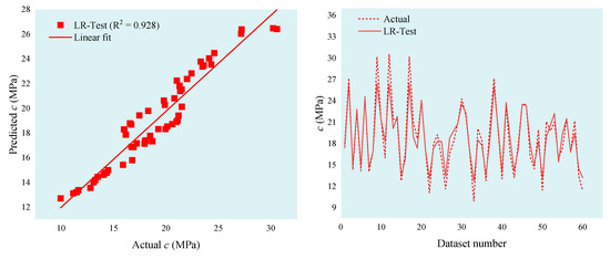 In the same manner, Figure 5 shows a comparison of scatter plots and performance plots between the actual and predicted values of the c (MPa) at the test level for the LR, RR, DT, and SVM models. Based on the test prediction, the R2 of each model is computed. The R2 values of LR, RR, DT, and SVM models for the c (MPa) are 0.928, 0.934, 0.961, and 0.977, respectively.