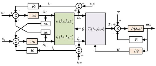 The proposed machine model is developed as shown in Figure 2 considering the given fact of Equation (5). The inputs are the voltages vd, and vq. The flux-linkages (λd and λq) are estimated using Equation (6). The ida and iqa currents are obtained from the flux inverse model that is given by Equation (7). The motor torque is obtained as a function of currents (ida, iqa) and rotor position θi. The iron losses are represented by the currents id-fe and iq-fe. The estimation of iron losses within the model is given in a later section. Finally, the equation of mechanical motion is used to estimate the rotor position and speed.